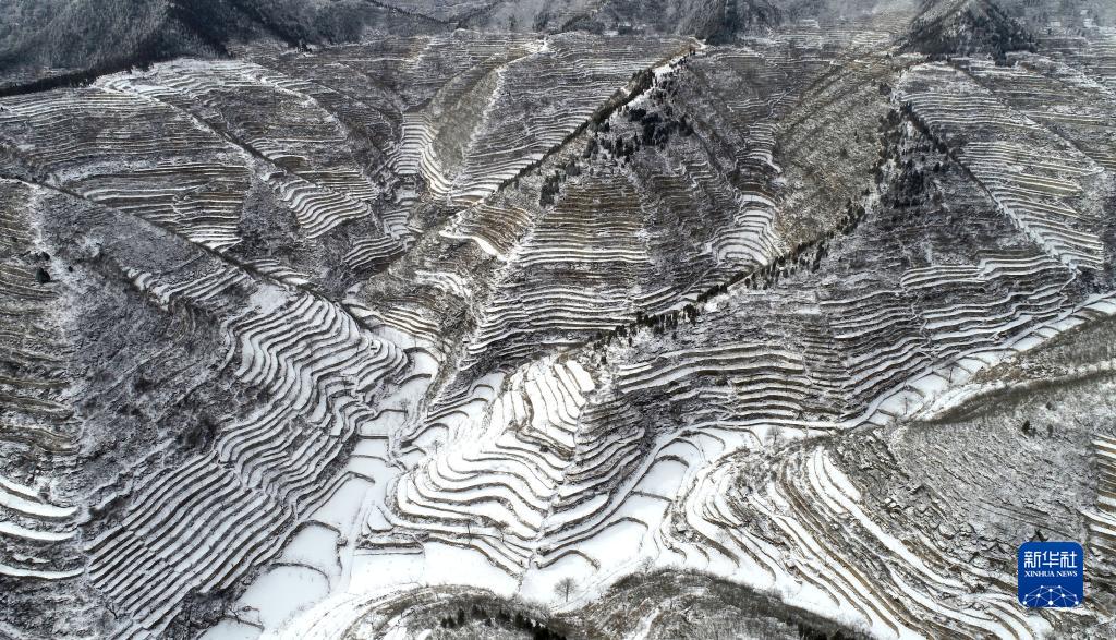 1月15日在河北省邯郸市涉县王金庄拍摄的雪后梯田景色(无人机照片)。