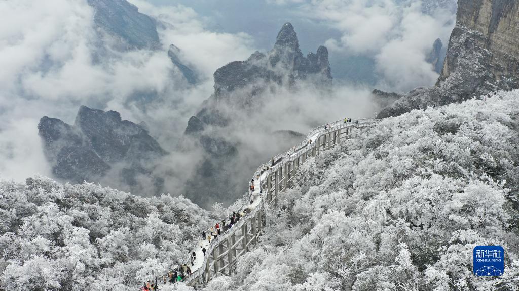 1月16日,游客在湖南省张家界天门山风景区观赏雪后美景(无人机照片)。