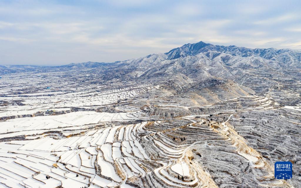 1月15日拍摄的山西省临汾市襄汾县陶寺乡梯田雪景(无人机照片)。