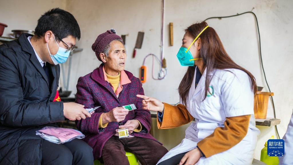 医务工作者和党员先锋队队员(左)到六盘水市钟山区金盆苗族彝族乡营盘村村民家中巡诊送药(1月6日摄)。