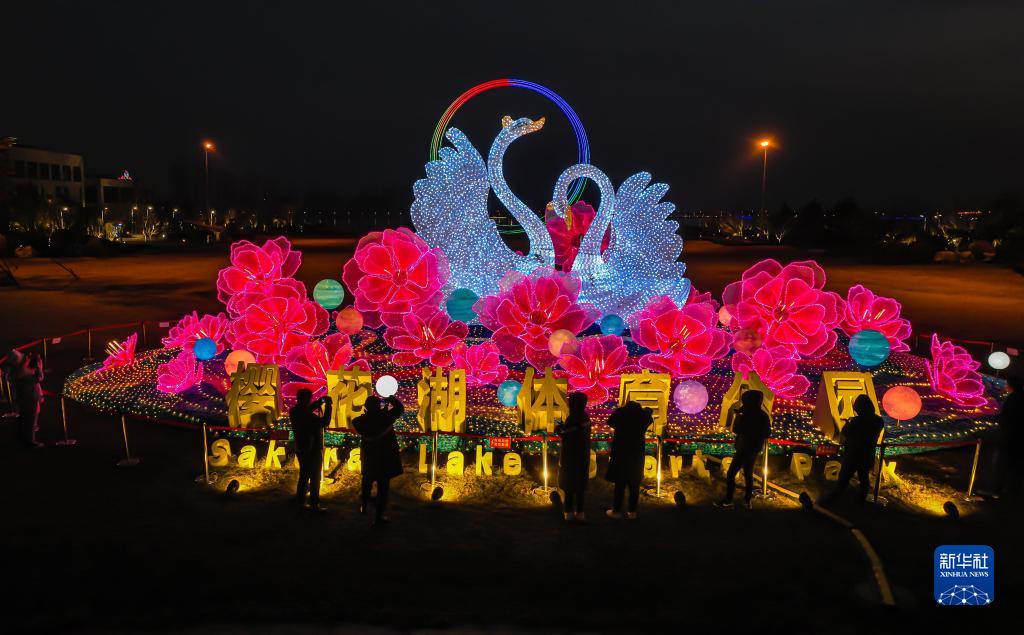 1月17日夜晚,在山东省荣成市樱花湖体育公园,市民在“天鹅花灯”前拍照、打卡。