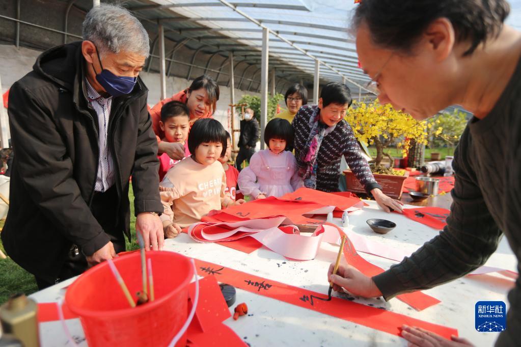 1月18日,在山东省临沂市沂南县铜井镇香山村,书法爱好者为群众写春联。