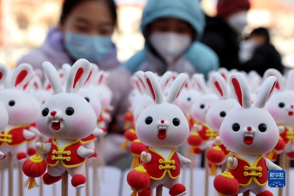 1月18日,在山东省枣庄市文化馆,小朋友在挑选面塑“萌兔”。