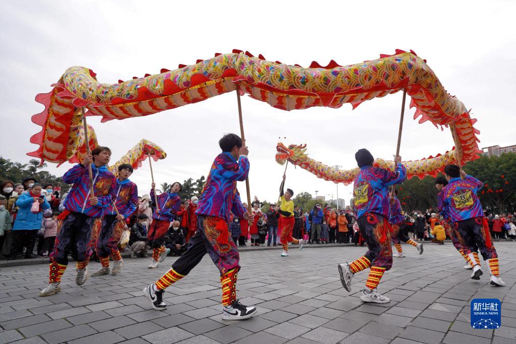1月18日,在广西桂林市灵川县,人们在春节喜乐嘉年华活动上表演舞龙。