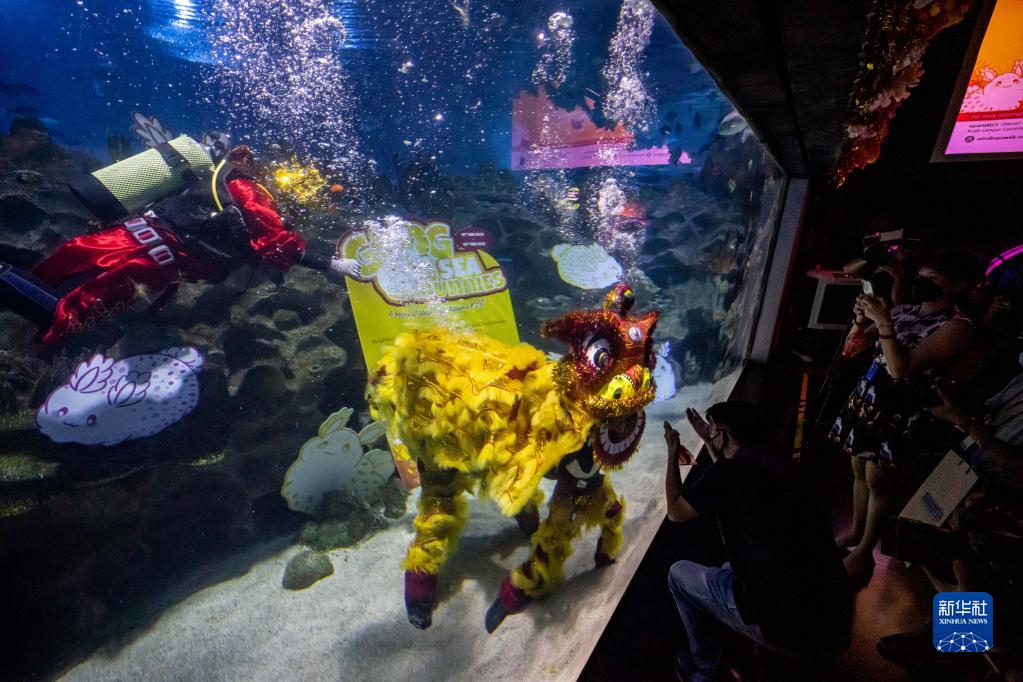 1月18日,潜水员在马来西亚吉隆坡城中城水族馆进行水中舞狮和“财神”拜年表演。