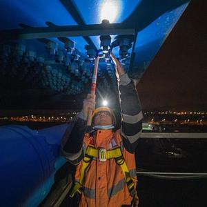 1月18日凌晨,铁路工人在检查杭台高铁椒江特大桥桥墩。