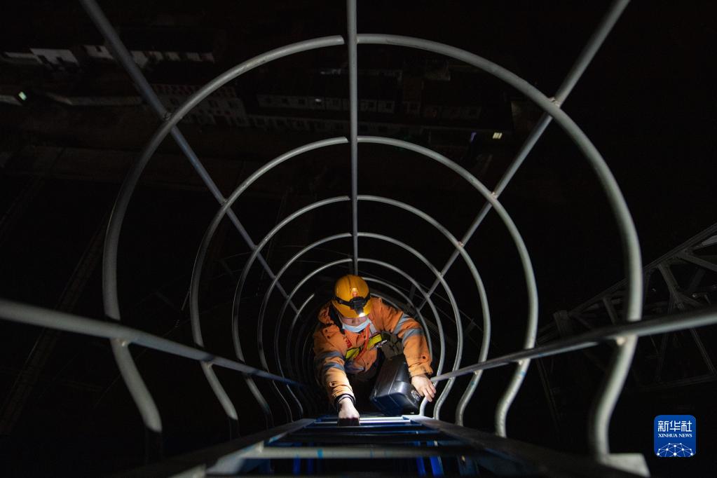 1月18日凌晨,铁路工人爬下检修梯,准备对杭台高铁椒江特大桥桥墩进行检查。