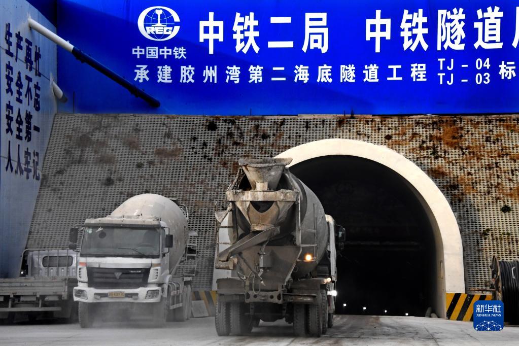 1月17日,运送水泥的工程车辆准备从施工隧道进入海底。