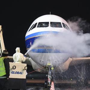 1月17日晚,在贵阳龙洞堡国际机场,南方航空的机务人员进行除防冰作业。