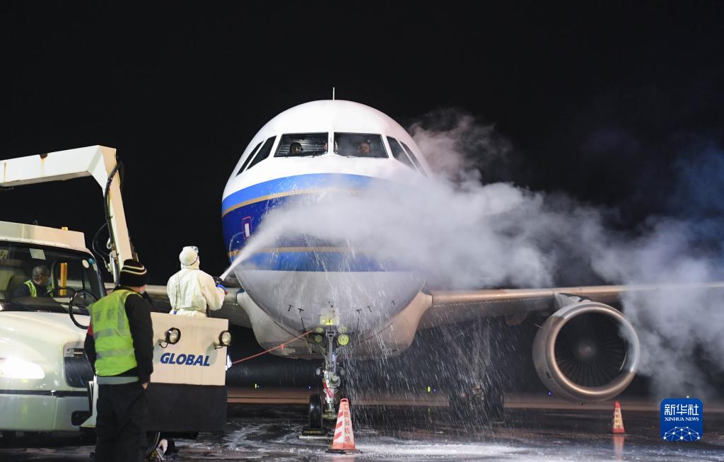 1月17日晚,在贵阳龙洞堡国际机场,南方航空的机务人员进行除防冰作业。