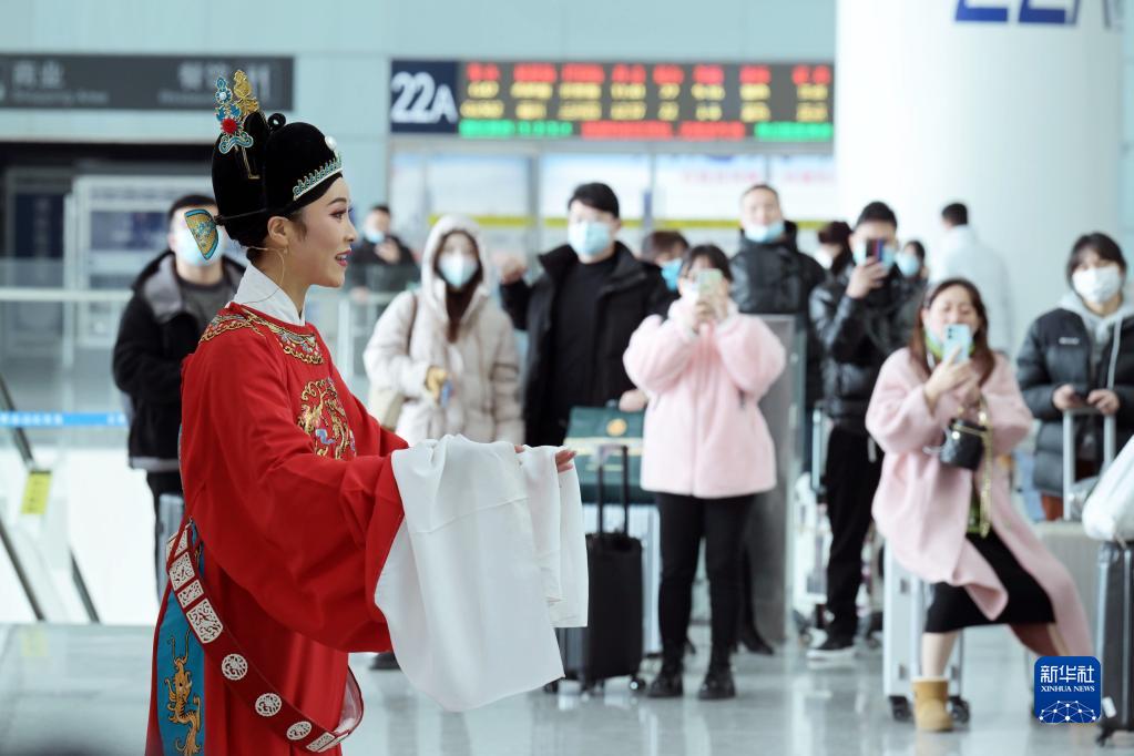 当日,一场“徽文化送我回家过大年”活动在合肥南站举行,安徽省黄梅戏剧院多位演员在候车大厅内为旅客带来精彩的黄梅戏演出,营造浓厚的春节氛围,让广大旅客回乡路上体验浓浓“年味”。