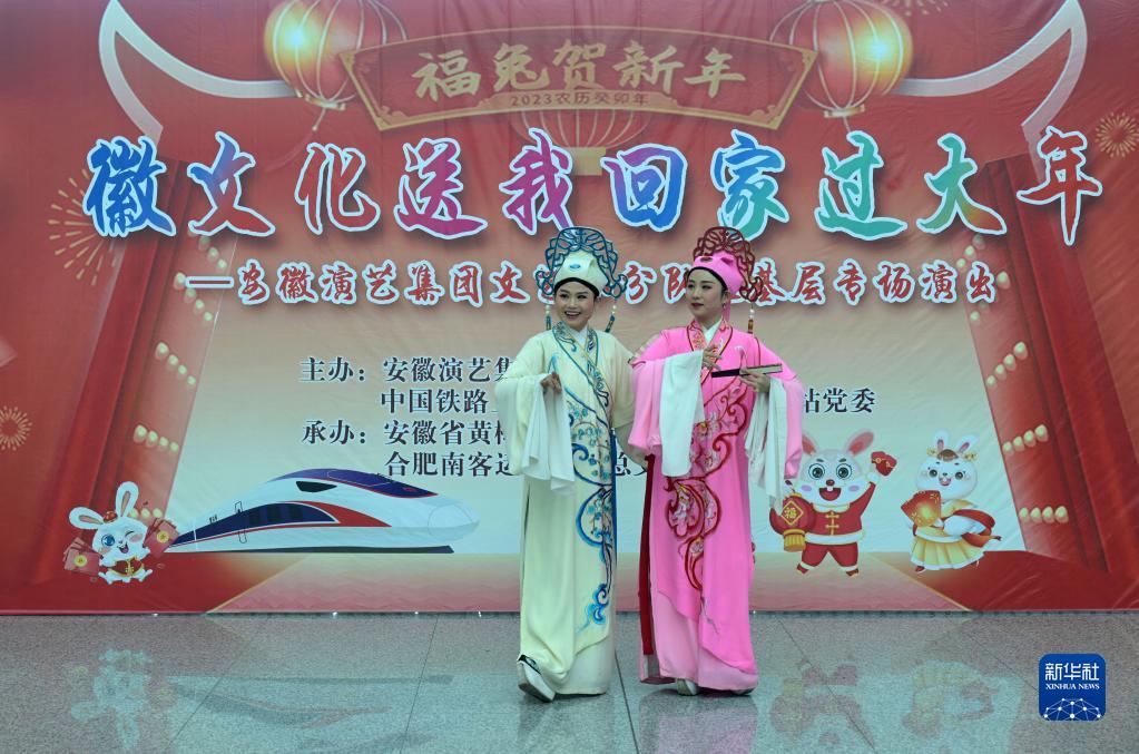 当日,一场“徽文化送我回家过大年”活动在合肥南站举行,安徽省黄梅戏剧院多位演员在候车大厅内为旅客带来精彩的黄梅戏演出,营造浓厚的春节氛围,让广大旅客回乡路上体验浓浓“年味”。