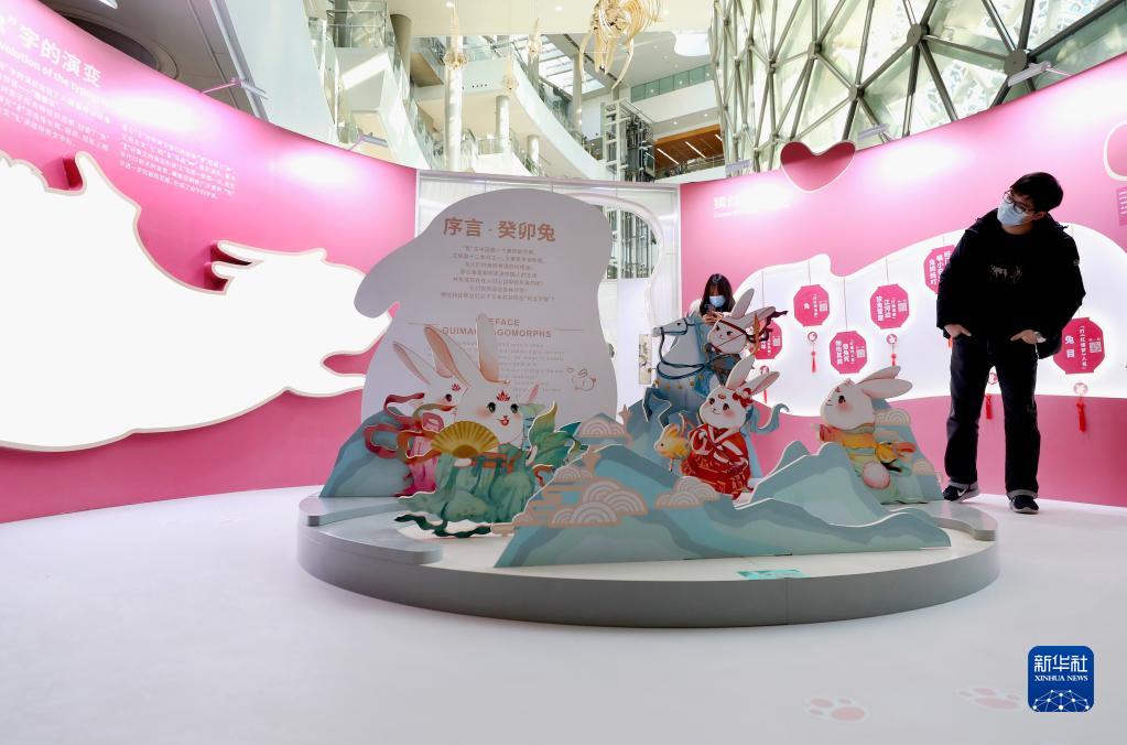 1月18日,参观者在一组兔子主题的卡通造型装饰旁驻足观看。