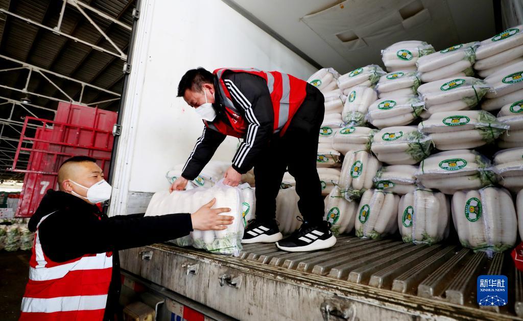 1月17日,在上海江桥蔬菜批发市场内,批发商王加中(右)将来自重庆的白萝卜卸下货车。