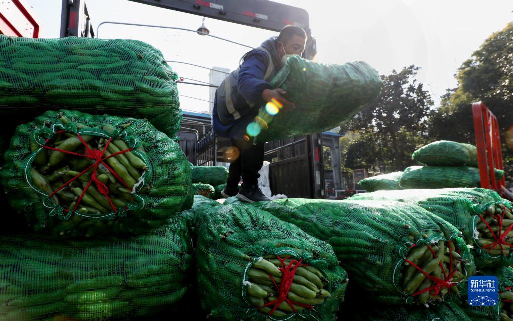1月17日,在上海江桥蔬菜批发市场内,一位客商将来自云南的蚕豆从卡车上卸下。