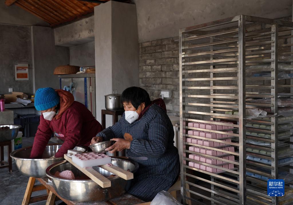 1月17日,在青浦区练塘镇的米乐农庄,居民赶制传统特色糕点奘糕。