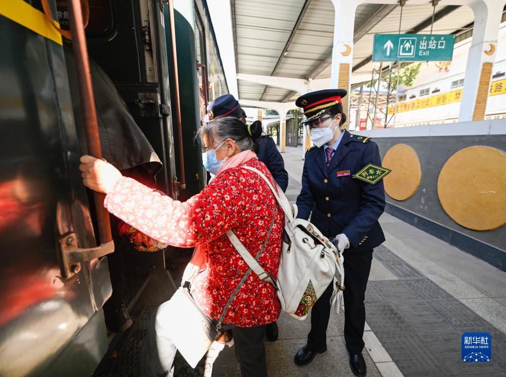 1月16日,攀枝花开往普雄的5634次“慢火车”停靠西昌站,妹妹韩姚(右)在引导旅客上车。