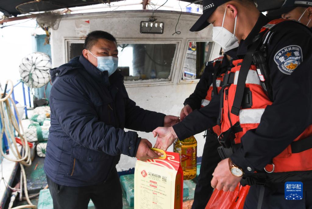 1月18日,在海口新港码头,海南省公安厅海岸警察总队第一支队民警将慰问品带给仍留守在船上的渔民。
