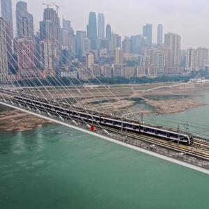 1月18日,重庆轨道交通10号线列车通过南纪门轨道大桥(无人机照片)。