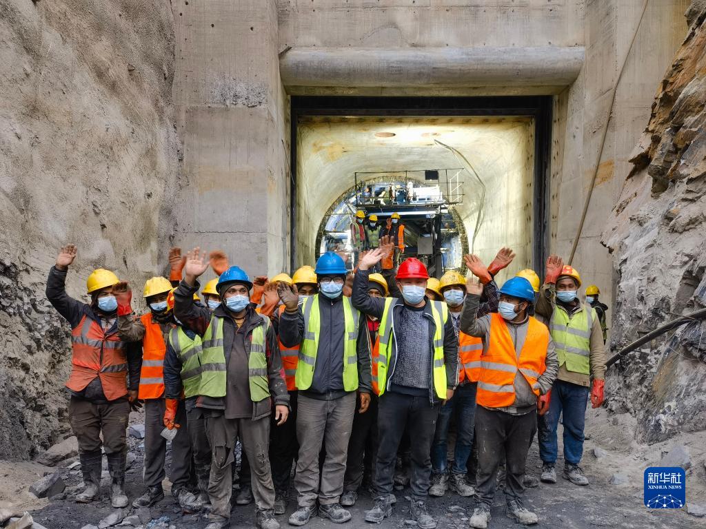 1月18日,工人庆祝尼泊尔塔纳湖水电站第2标段项目完成尾水洞衬砌混凝土浇筑。
