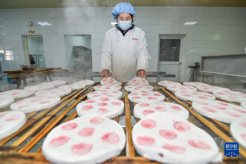 1月17日,在江苏省南通市如皋市老万和潮糕店,工作人员在整理刚蒸好的林梓潮糕。林梓潮糕是当地传统点心,由糯米、粳米加工成米粉,拌上白糖、桂花等制成糕坯,再经多道工序蒸制而成。