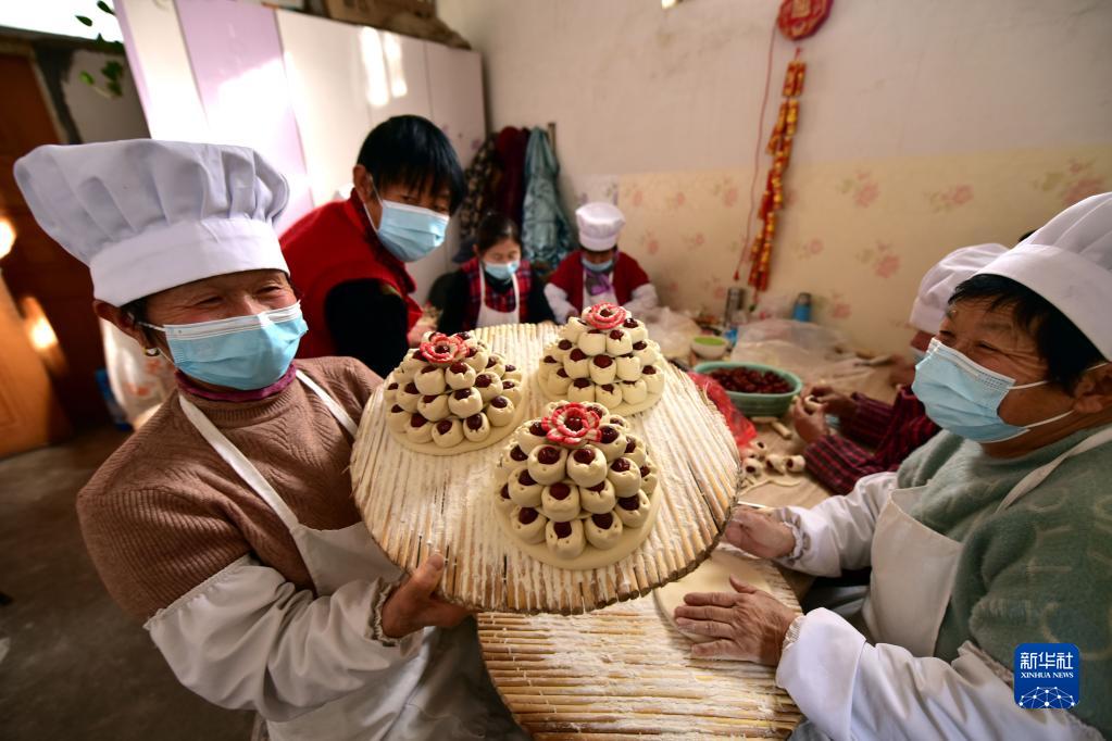 1月19日,山东省聊城市茌平区贾寨镇的村民在展示制作好的花糕。