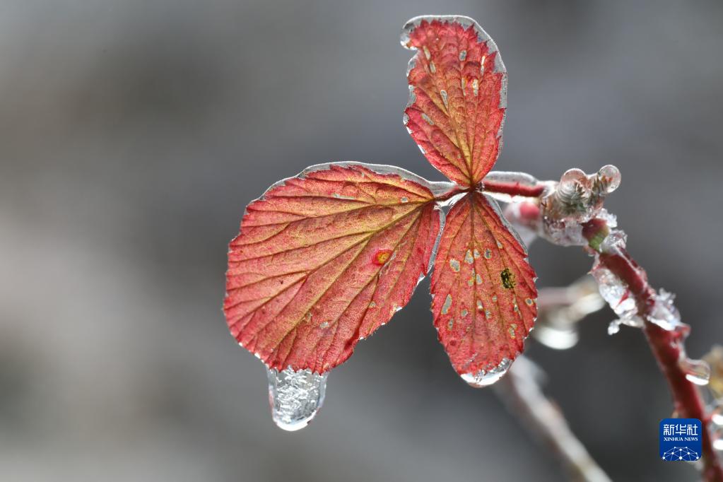 云南腾冲市马站乡响水沟山谷里,叶片上凝结了晶莹透亮的冰(1月14日摄)。