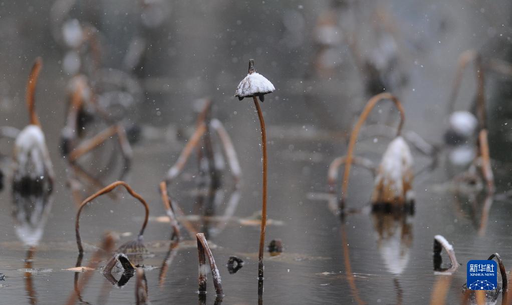 山东省滕州市龙泉广场,雪花落在莲蓬上(1月14日摄)。