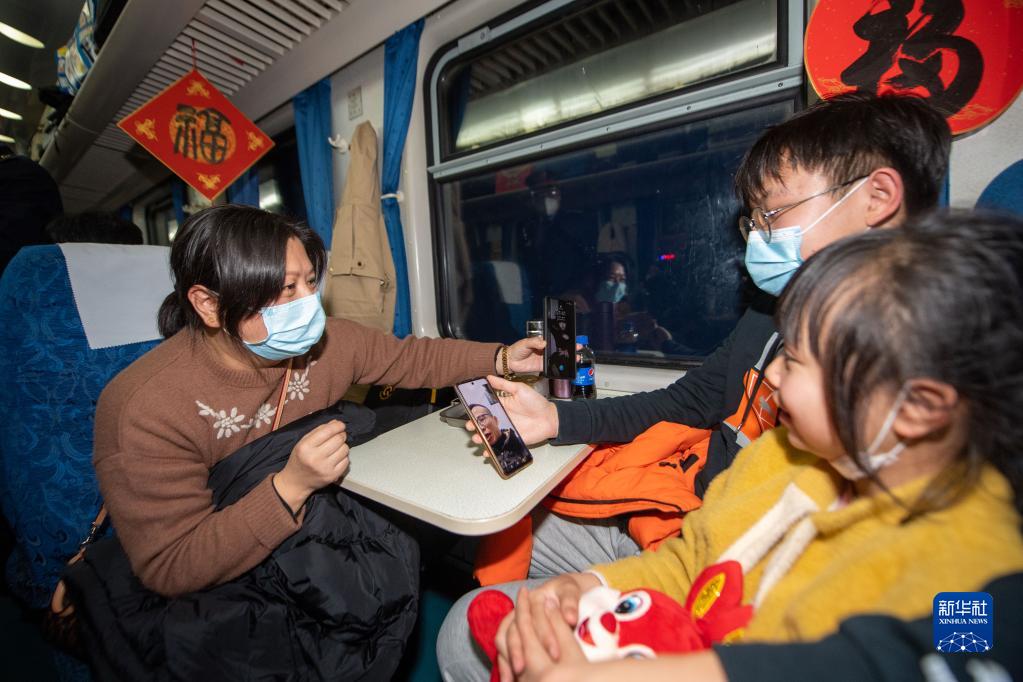 1月18日,回广东韶关老家过年的旅客卜慧芬(左)在K209次列车上和儿子女儿一起与留守浙江的丈夫视频通话。
