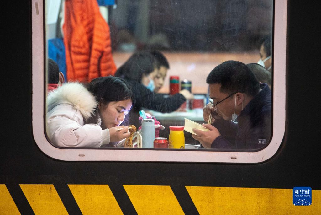 1月18日,旅客在K209次列车上吃晚餐。