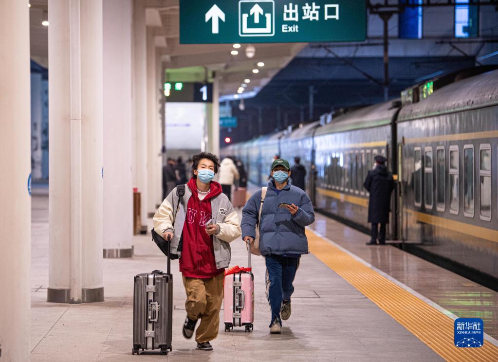 1月18日,准备乘坐K209次列车的旅客在金华站站台上奔跑。