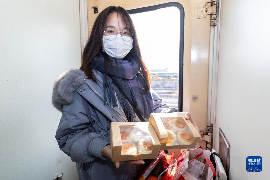 1月18日,一名“90”后女生在1462次列车上展示为家人购买的上海特产“鲜肉月饼”。列车即将到站,女生早早来到车门口等待。