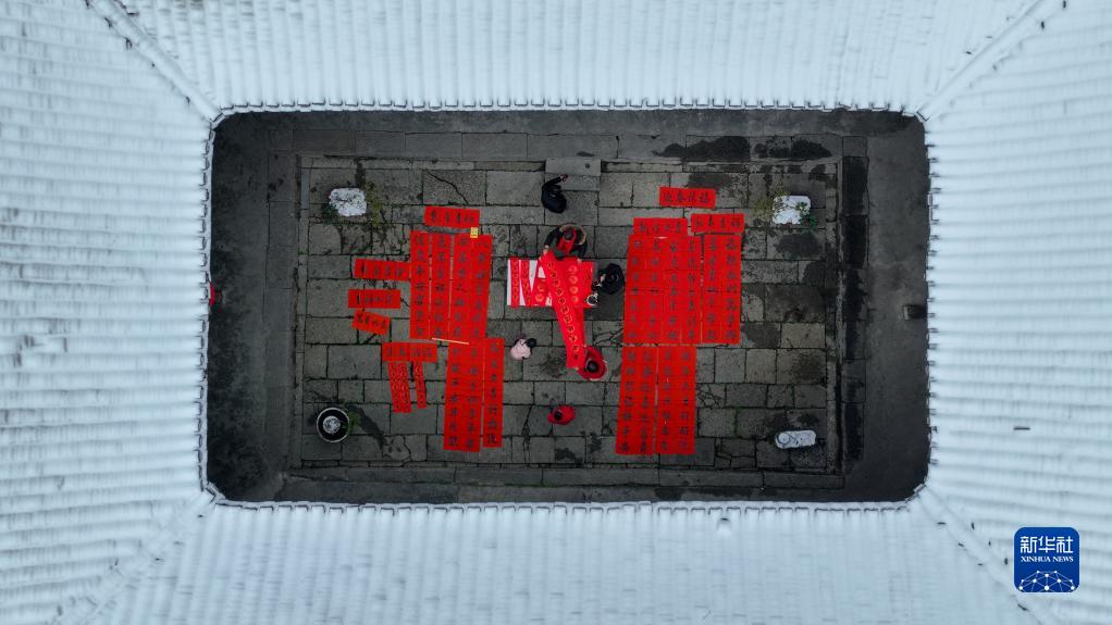 1月18日,在重庆市酉阳土家族苗族自治县桃花源街道龙池村洞子坨传统村落,当地书法爱好者在四合院里为村民书写春联。
