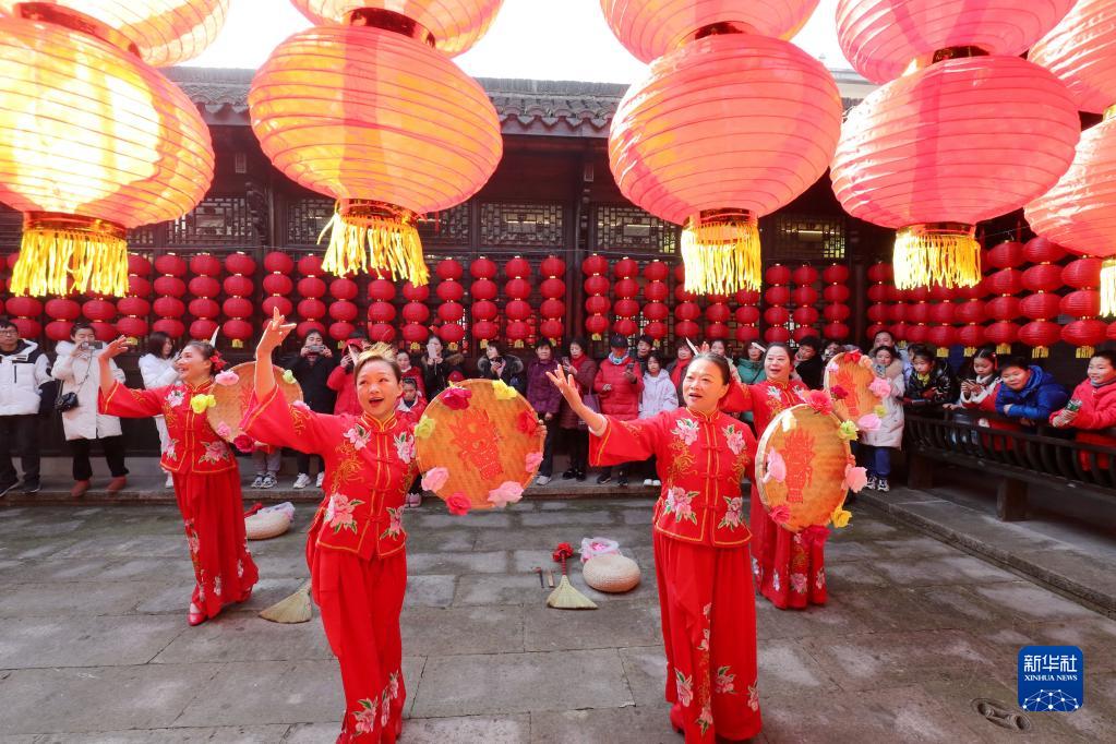 1月18日,民间艺人在浙江省湖州市德清县乾元古城弄堂里表演国家级非物质文化遗产节目《扫蚕花地》。