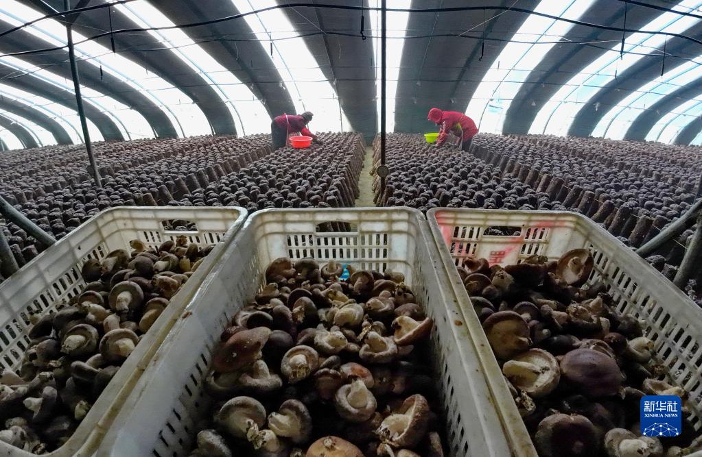 1月19日,唐山市丰润区任各庄镇的农民在大棚内采摘香菇。
