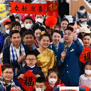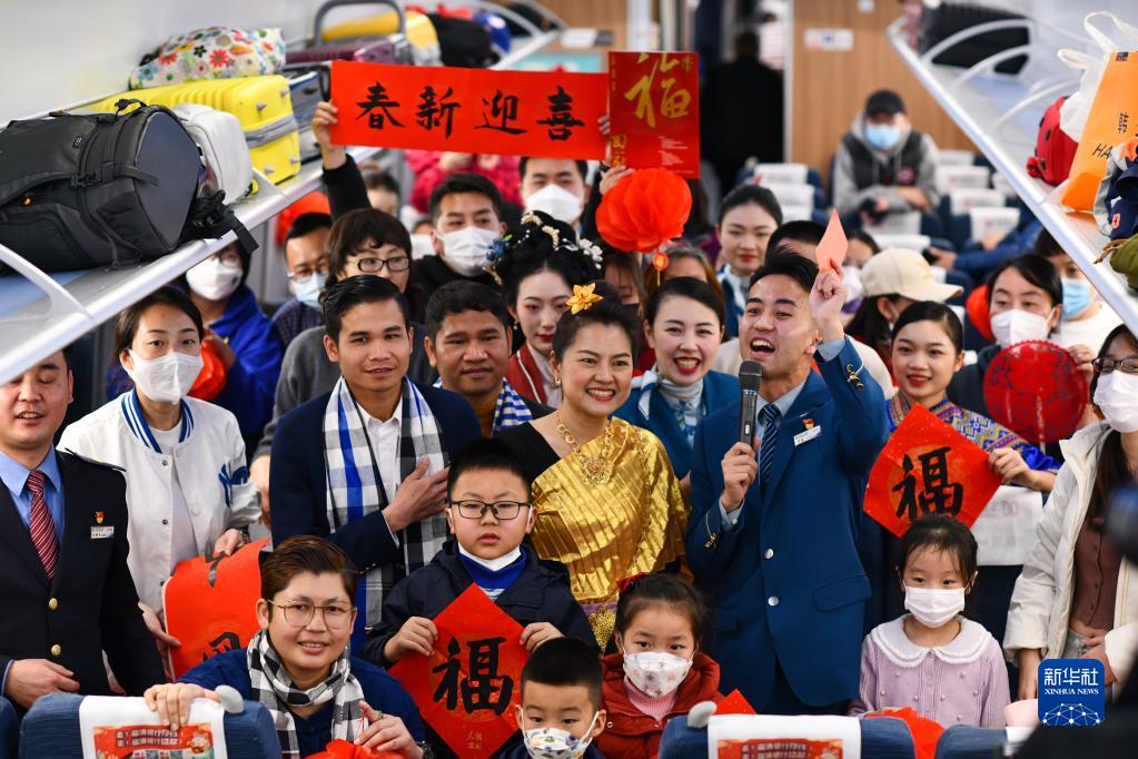 当日,奔驰在中老铁路上的C272次列车车厢内,一场以“中老一家亲,祥和中国年”为主题的列车春晚精彩上演。