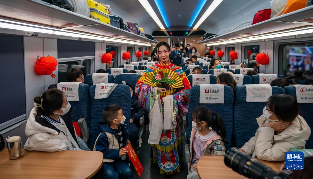 1月19日,京剧演员在车厢内表演《贵妃醉酒》选段。