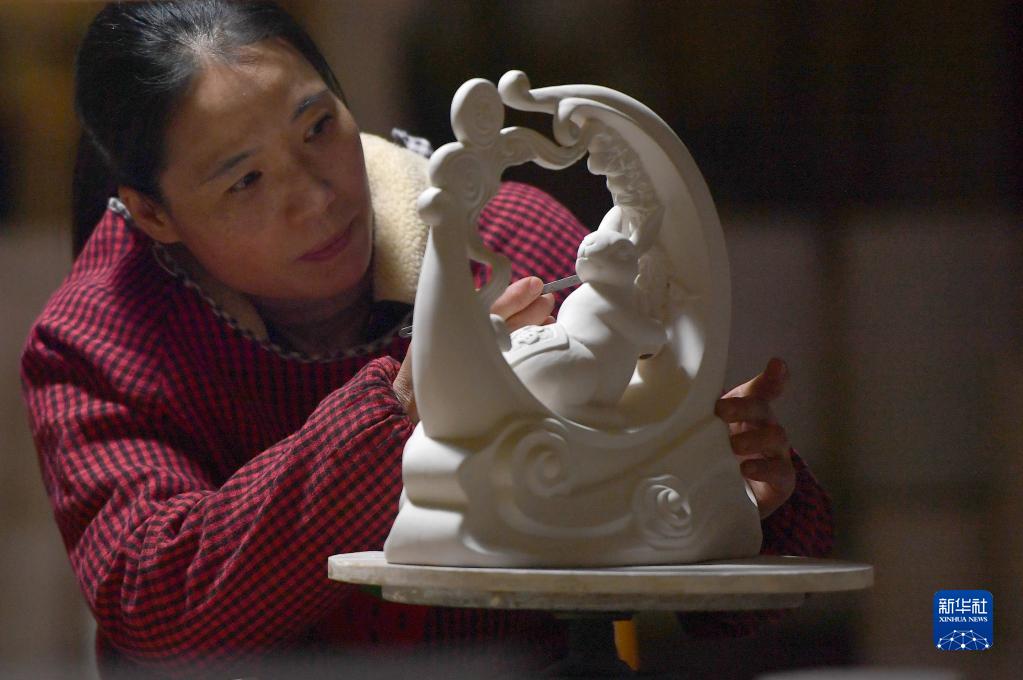 1月18日,在宝丰县张八桥镇一家汝瓷生产企业,汝瓷艺人在修饰汝瓷生肖兔素胎。
