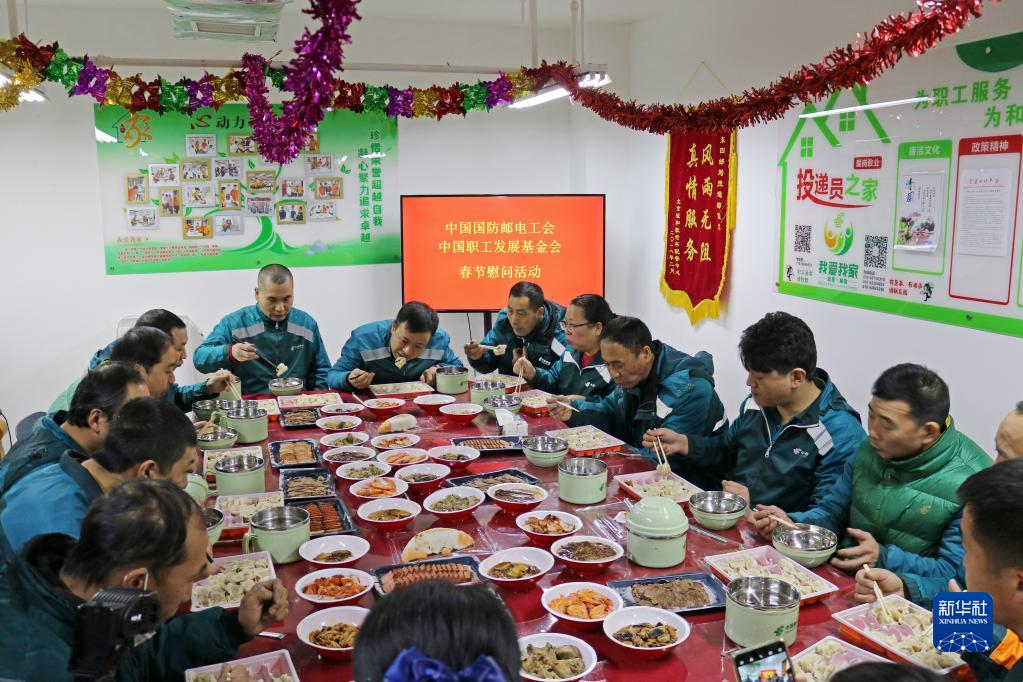 1月18日,在位于北京市东城区的中国邮政集团有限公司东四邮政支局,一线职工一起吃慰问活动送来的年夜饭菜品。