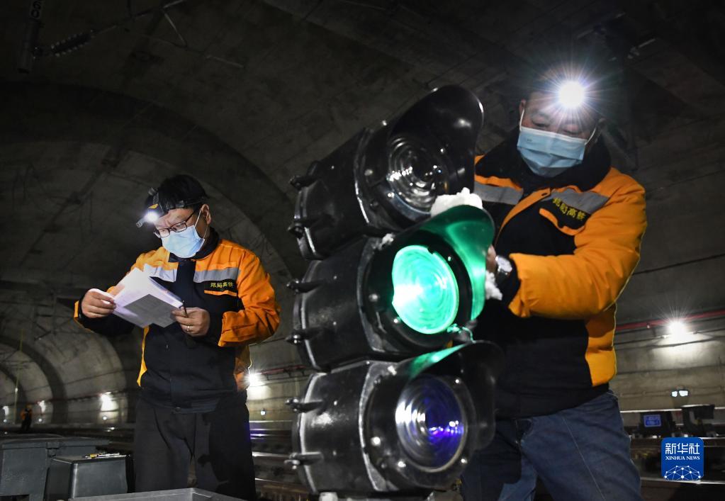 1月19日凌晨,郑州高铁基础设施段作业人员在新郑机场站北岔区保养信号机设备。