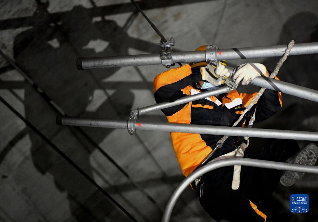 1月19日凌晨,郑州高铁基础设施段作业人员对新郑机场站北岔区接触网支撑装置进行检修。