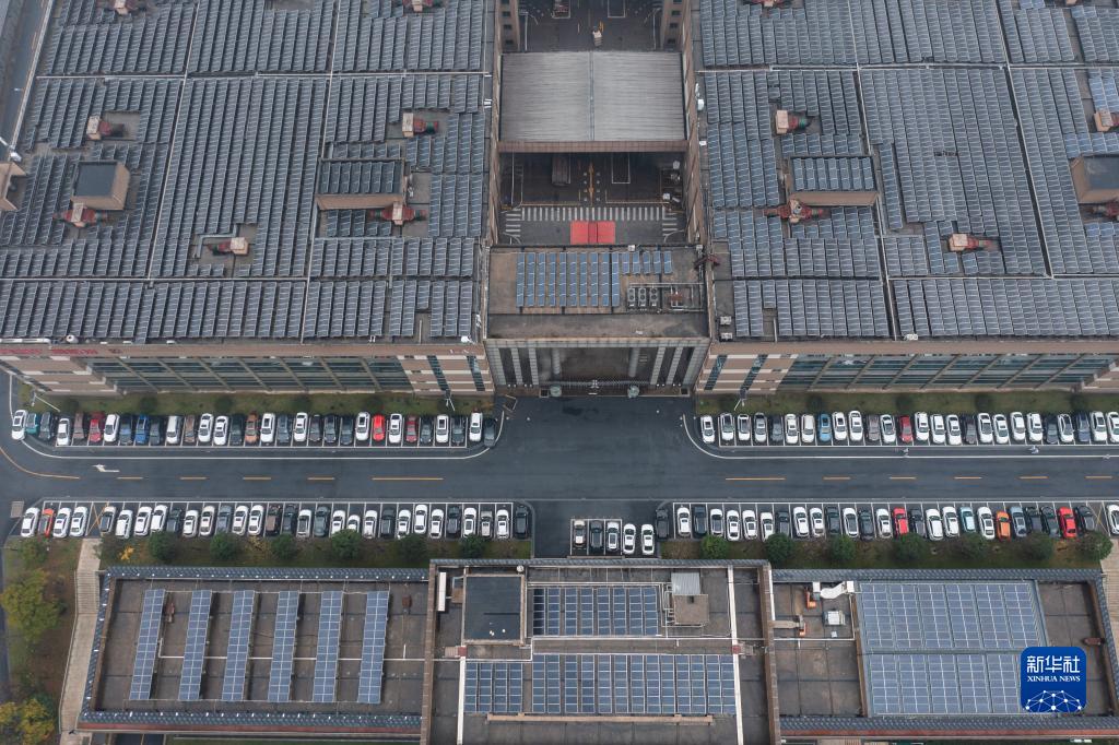 这是浙江省杭州市临安区金马工业园区内的一家“无废工厂”,屋顶上安装了光伏发电设备(2022年12月9日摄,无人机照片)。