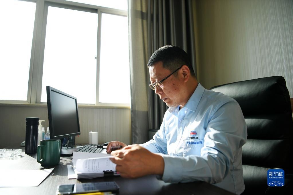 梅东冬在雄安新区至北京大兴国际机场快线(R1线)一标段项目部办公室工作(1月18日摄)。