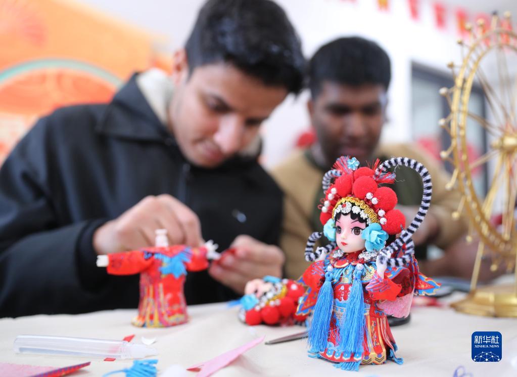 1月19日,山东科技大学的留学生在制作绢人工艺品。
