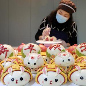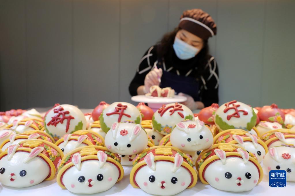 春节临近,安徽省淮北市一些面点师以兔为主题,创作出各式各样的“萌兔”花馍,供应节日市场,迎接新春佳节的到来。