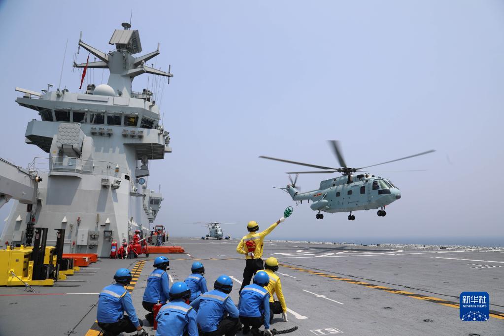 海南舰位南海某海域开展登陆演练,甲板引导员对直升机进行引导(资料照片)。