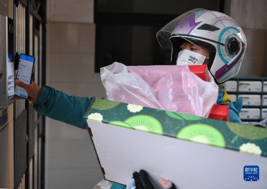 李文在西安市灞桥区一小区内配送商品(1月18日摄)。