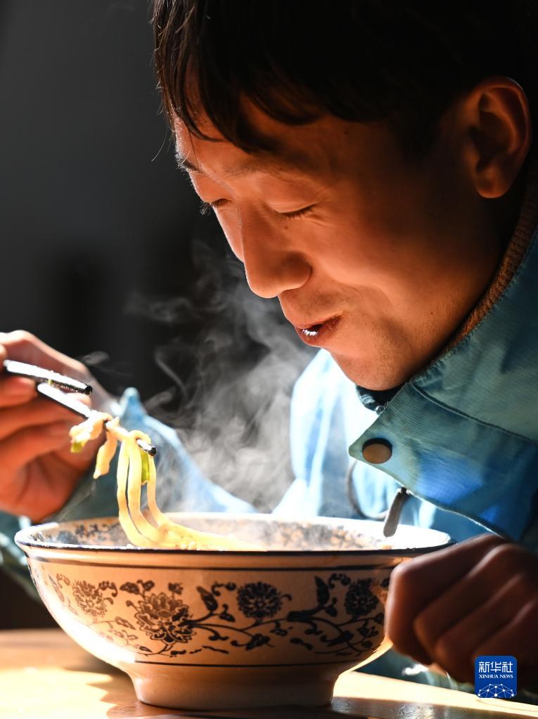 一上午忙碌过后,李文在西安市灞桥区一家面馆吃午餐(1月18日摄)。