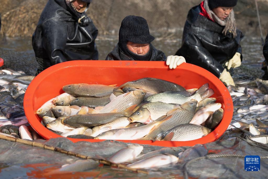 连日来,河北省唐山市丰南区的水产养殖户们忙着在池塘内破冰捕鱼,以供应春节市场。