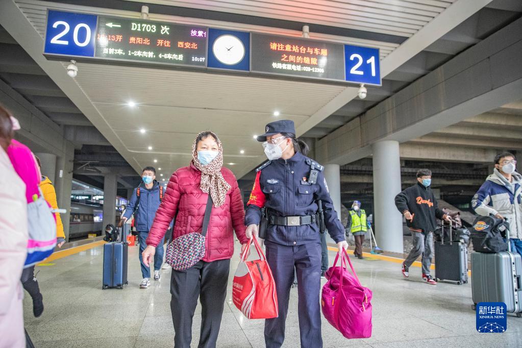 1月16日,在重庆西站列车站台,重庆铁路公安处乘警支队“芳华”女子乘务警组的朱小丽带领旅客前往候车位置。